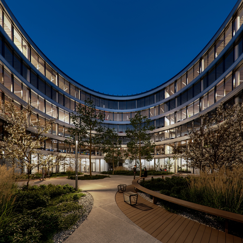 Organické tvary budovy se umně snoubí s industriálními prvky a nejmodernějšími technologiemi uvnitř. Fasádu tvoří skleněná okna s černými hliníkovými zalamovanými klapkami širokými půl metru a vysokými přes celé patro. Díky klapkám vypadá budova z různých úhlů odlišně. Mezi etážemi budou umístěny pásy z perforovaného plechu.